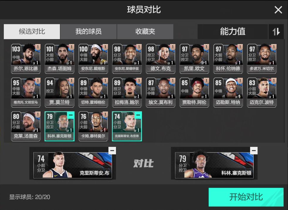 选中两名目标球员,点击开始对比。