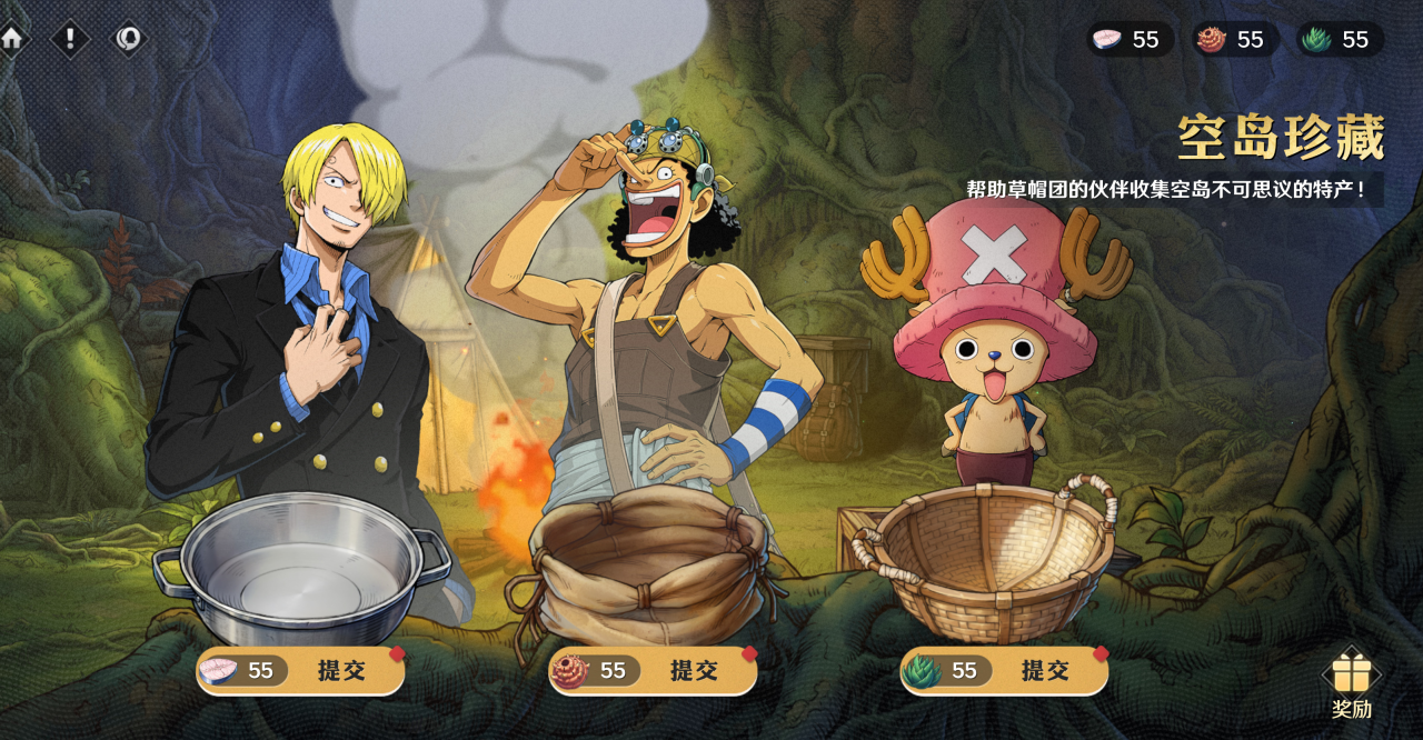 活动内容:活动期间,领取每日任务宝箱奖励、消耗体力可获得空岛珍藏;将不同的珍藏交给对应的草帽团伙伴后,可获得伙伴的不同回礼;提交一定数量的珍藏后,还可以领取额外奖励。