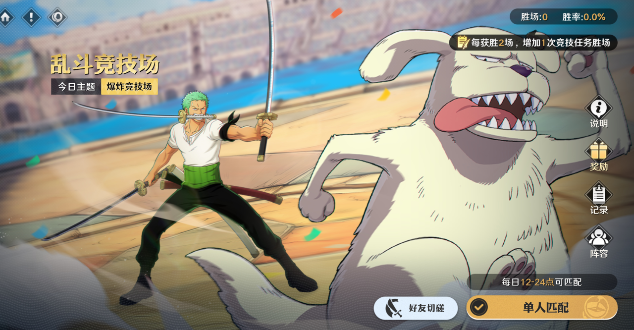 活动内容:由多种不同战斗规则组成的PVP乱斗玩法,玩法内只可上阵1名伙伴,双方1局定胜负;每日的乱斗主题不同,5点时刷新;参与乱斗竞技场可同步完成竞技任务,每获胜2场可增加竞技任务本周胜场1场。