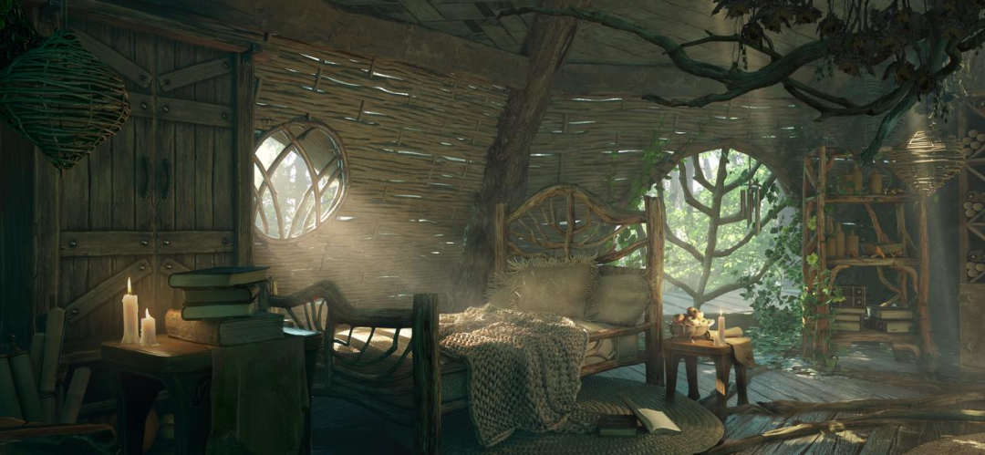 巨树根部连绵的木屋是木精灵们地居所。