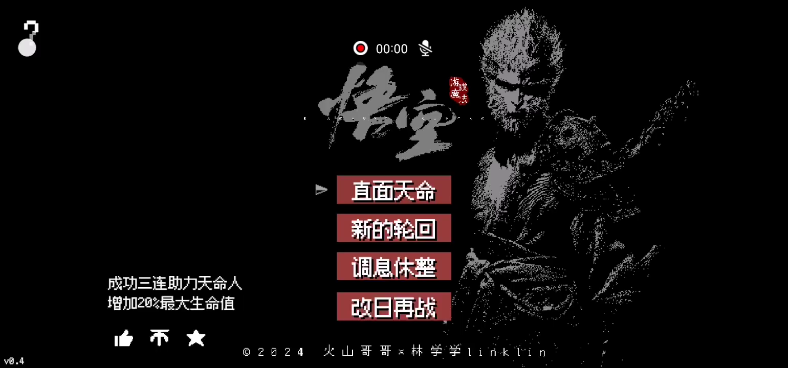 《黑神话悟空》像素版来袭啦!火山哥哥化身像素大师,将经典场景还原得淋漓尽致,十个不同地图场景让你眼花缭乱。孙悟空的移动、跳跃、战斗系统全部上线,连蓄力劈棍、棍花闪避都超级流畅,简直是像素版战斗艺术!小狼妖、大头、金池长老等BOSS悉数登场,每个都有独特招式,让你体验不一样的战斗乐趣!更有喝酒功能、定身术、存档系统等丰富玩法,让游戏不再单调。 游戏更新: 全新春节版本更新,0.4版本来袭,更新新地图小西天,7种小怪,BOSS亢金龙、年兽等! 0.4版兼容旧版的存档,从黄风大圣战场的筋斗云处可以直接到第三章地图。