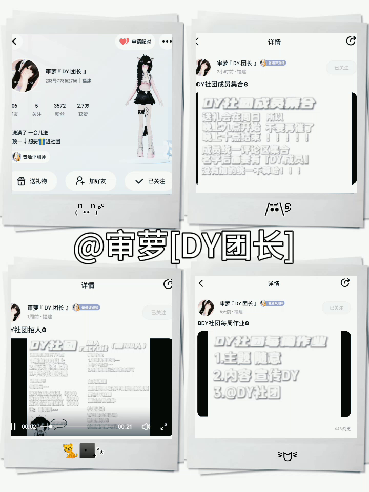 DY社团要求:粉丝100以上,要有素质,不给团招黑,每周团长都会送礼,不要催,按时完成作业