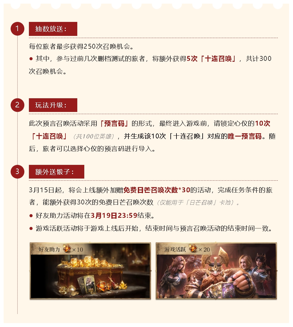 在活动期间,每位旅者均可前往「预言召唤」活动页面,通过任务获取至多250次召唤英雄的机会,从抽取结果中选取10次十连召唤结果,生成「预言码」。待「导入预言码」功能解锁后即可使用「预言码」进行结果导入,并在3月20日游戏公测上时,于「日芒召唤」卡池界面中,选择并确认最终预言召唤的结果。