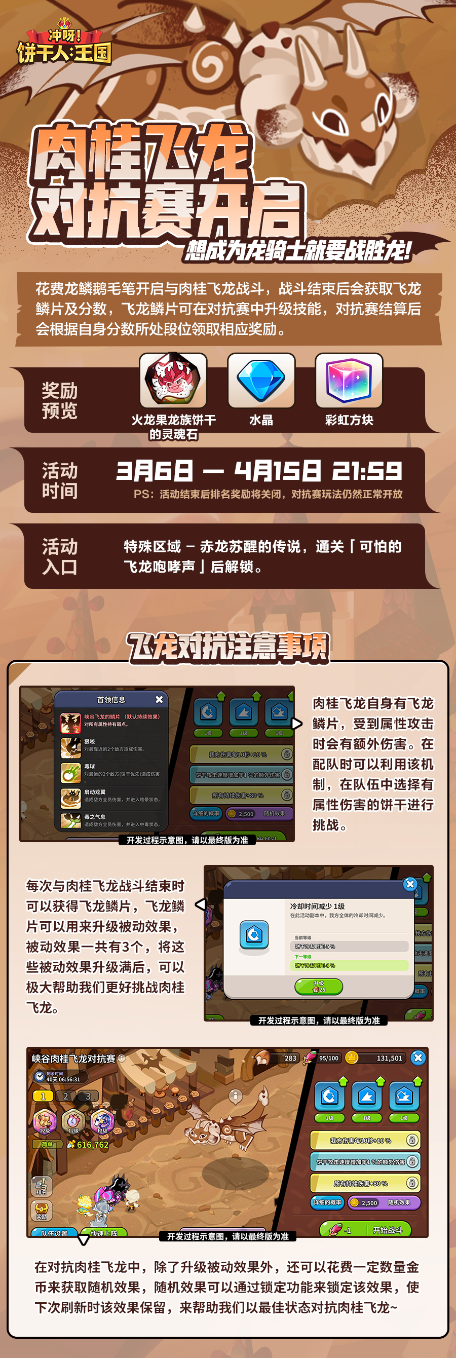 肉桂飞龙对抗赛即将开始!在特殊区域「赤龙苏醒的传说」当中,通关「可怕的飞龙咆哮声」,即可开启飞龙对抗赛——参与飞龙战斗可得火龙果龙族饼干灵魂石、彩虹方块、水晶等奖励!