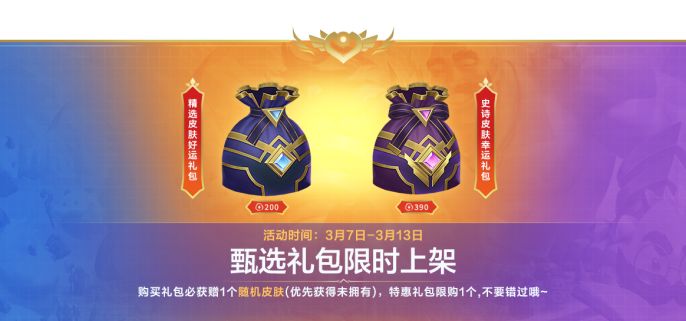 即日起至3月13日,甄选礼包限时上架!召唤师可前往商城,使用200点券购买精选皮肤好运礼包,使用390点券购买史诗皮肤幸运礼包。购买礼包必获赠1个随机皮肤(优先获得未拥有),特惠礼包限购1个,喜欢的召唤师不要错过哦~