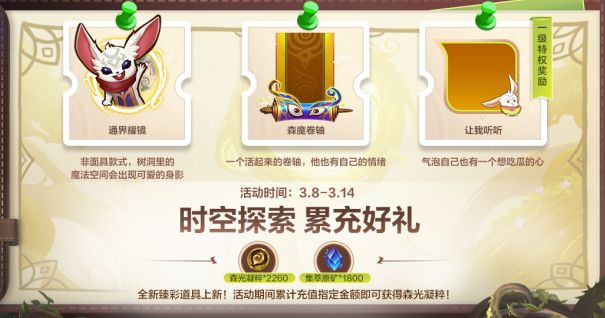 3月8日(明日)10点起至3月14日,全新臻彩道具上新!召唤师在活动期间累计充值点券至指定数量,即可获得对应的森光凝粹、集萃原矿好礼~