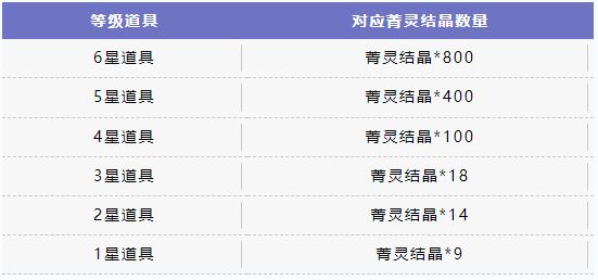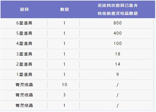 在「时空探索装置」中获得的重复道具,将根据下列规则折算为不同数量的「菁灵结晶」。