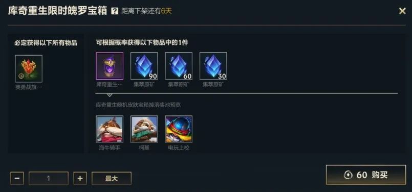 英勇投弹手 库奇更新后多项技能调整,真实伤害、超高爆发带来全新战斗体验!截止至3月12日23:59,召唤师使用60点券开启库奇重生限时魄罗宝箱,即可获得英勇战旗-金牛战旗(1天),还有机会获得库奇重生随机皮肤宝箱和集萃原矿好礼~