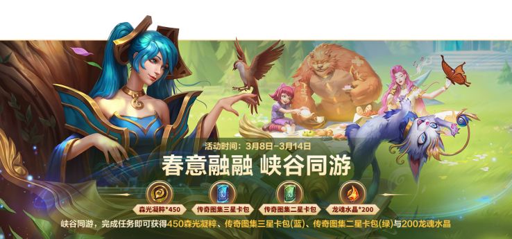 春意融融 峡谷同游峡谷同游赢好礼!3月8日(明日)10:00至3月14日23:59,召唤师完成任务即可获得森光凝粹*450、传奇图集三星卡包(蓝)、传奇图集二星卡包(绿)与龙魂水晶*200好礼~