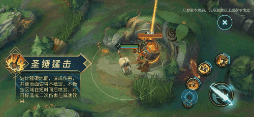 蓄力施放:猛砸地面产生冲击波,对首个命中的敌人及其周围敌人造成物理伤害,并将他们朝敌方水晶枢纽方向击退一段距离,飞行途中不可被选取。
