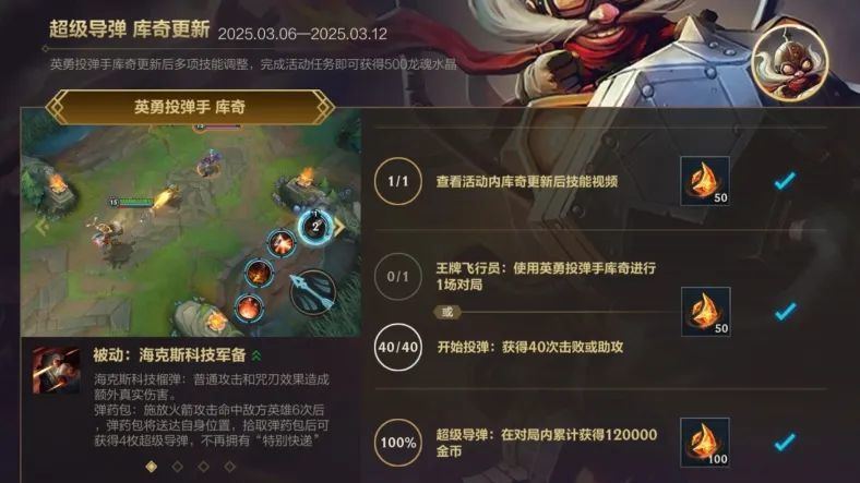 同时,截止至3月12日,召唤师完成“超级导弹 库奇更新”活动任务,即可获得龙魂水晶*500奖励!