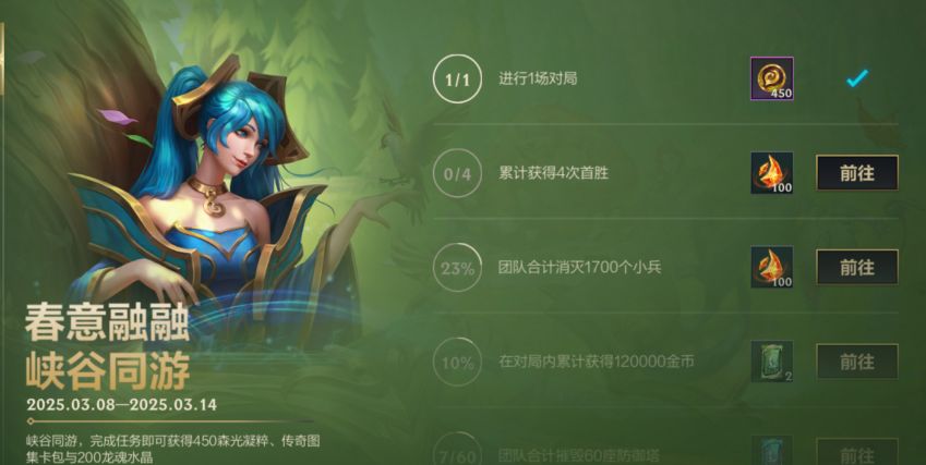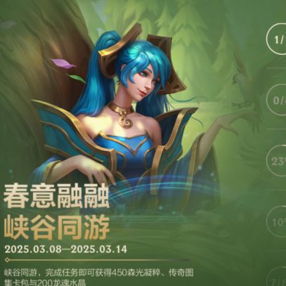峡谷同游赢好礼!即日起至3月14日23:59,召唤师完成任务即可获得森光凝粹*450、传奇图集三星卡包(蓝)、传奇图集二星卡包(绿)与龙魂水晶*200好礼~