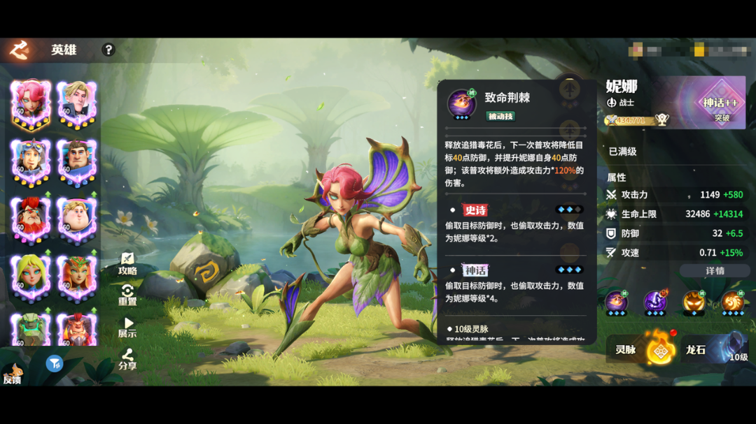 妮娜作为一个战士型英雄,她的被动技能”致命荆棘”能够对单体造成爆发性伤害,并偷取目标的防御强化自身。