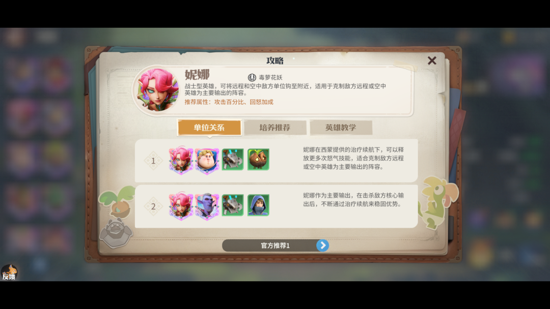 (1)跟西蒙的组合,妮娜在西蒙提供的治疗续航下,可以释放更多次怒气技能,适合克制敌方远程或空中英雄为主要输出的阵容。