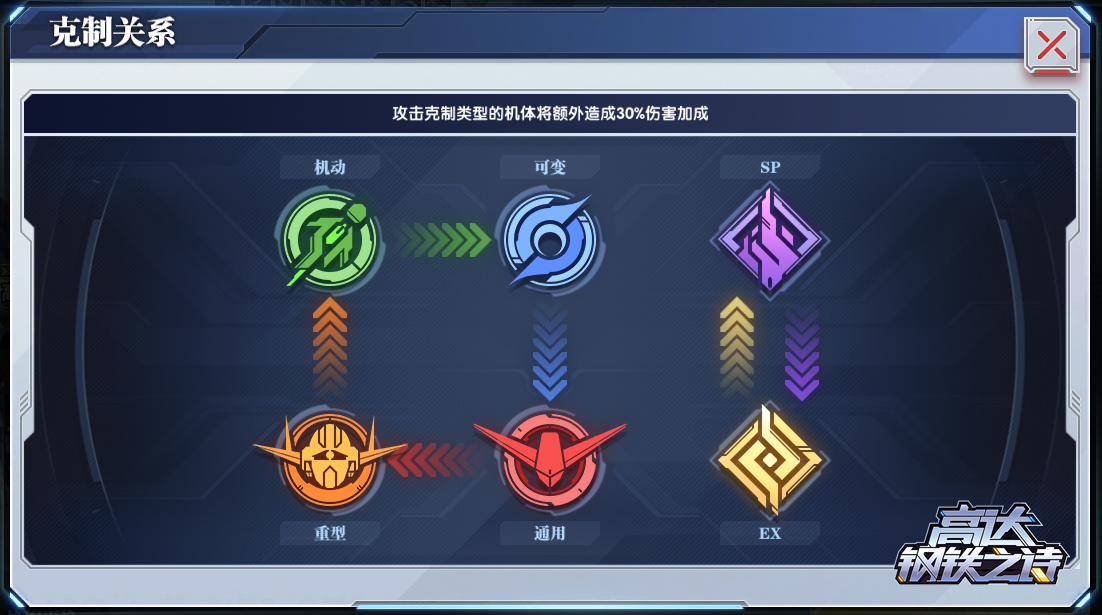 游戏中的6种机体类型存在互相克制的关系:机动克制可变,可变克制通用,通用克制重型,重型克制机动。例如,机动类机体攻击可变类机体时,将获得30%的伤害加成。“特殊形态”与“改造追加”类型的机体互相克制,攻击对方时均可获得30%的伤害加成。