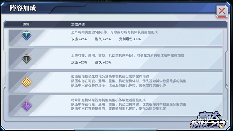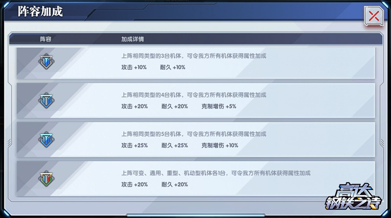 除了克制关系外,机体类型还会影响我们在编队时获得的阵容加成。上阵3台、4台、5台同类型机体时,所有机体将分别获得攻击和耐久的加成;上阵4台及以上同类型机体时,还可以获得额外的5%和10%克制增伤。