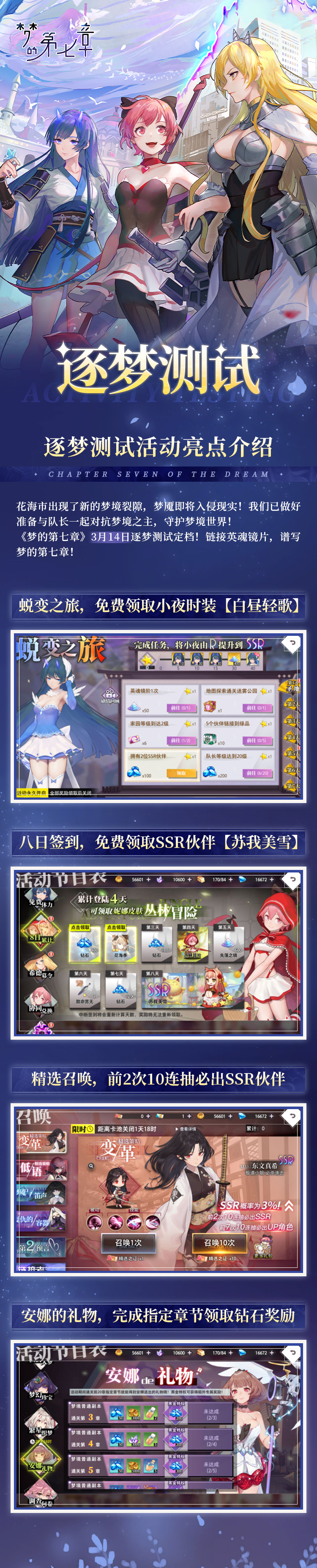 第7天:召唤之证*20,钻石*1999,SSR装备自选宝箱·庆典*1,精金伙伴之芯*60