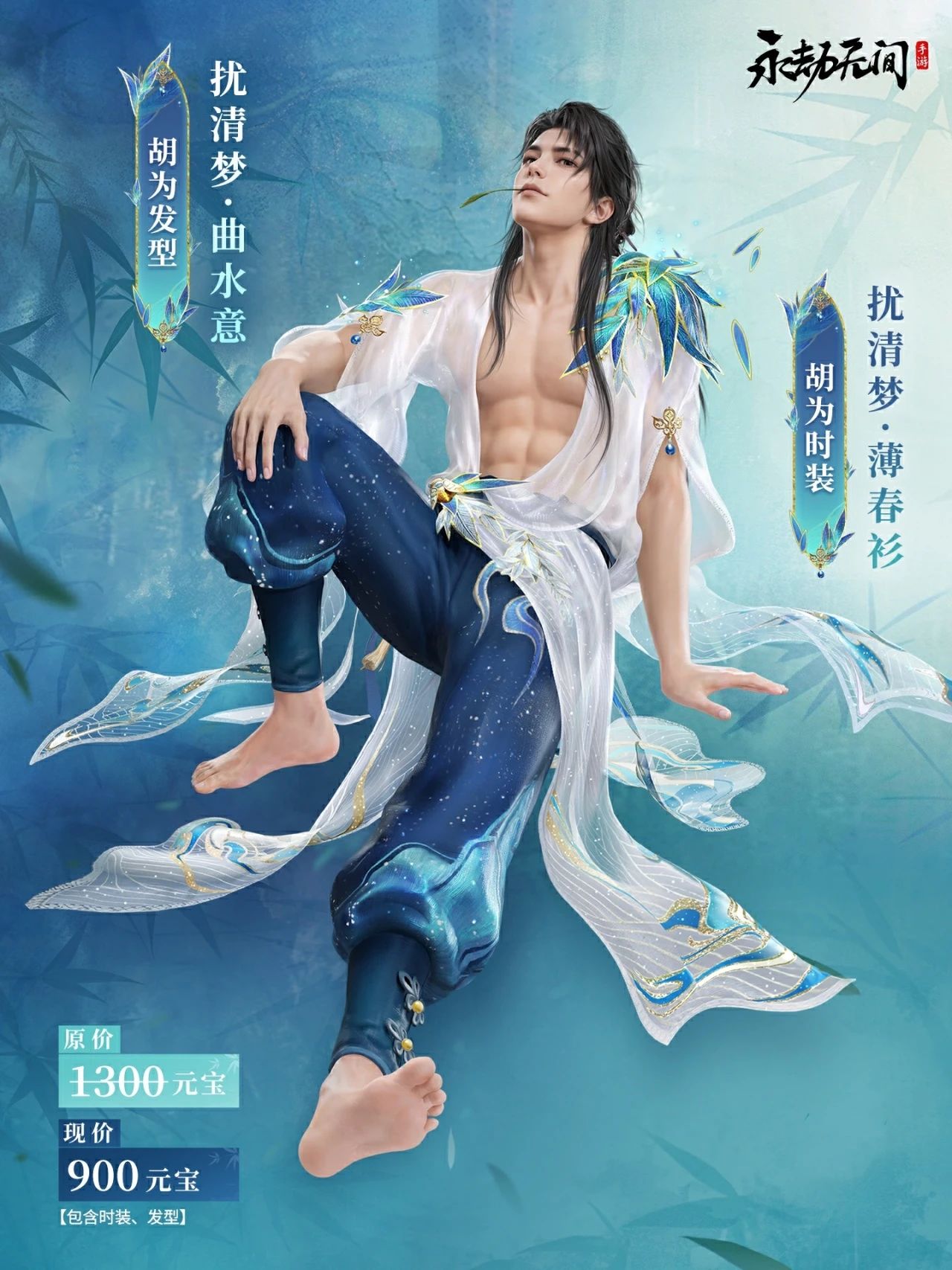 透明长衫潇洒脱尘,落肩处的竹叶装饰轻轻飘落,青色的下装外有云纹刺绣,颇具典雅。