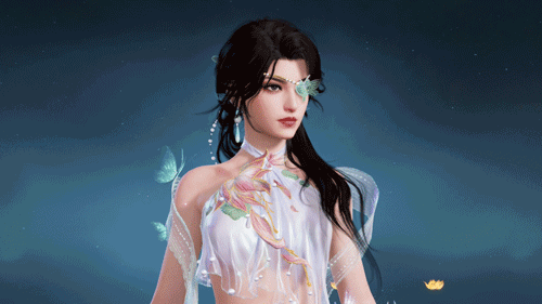 整体以青白色调的轻纱为主,星星点点的珍珠如露水般点缀其间。腰间的莲花初绽,引来蝶舞翩翩。