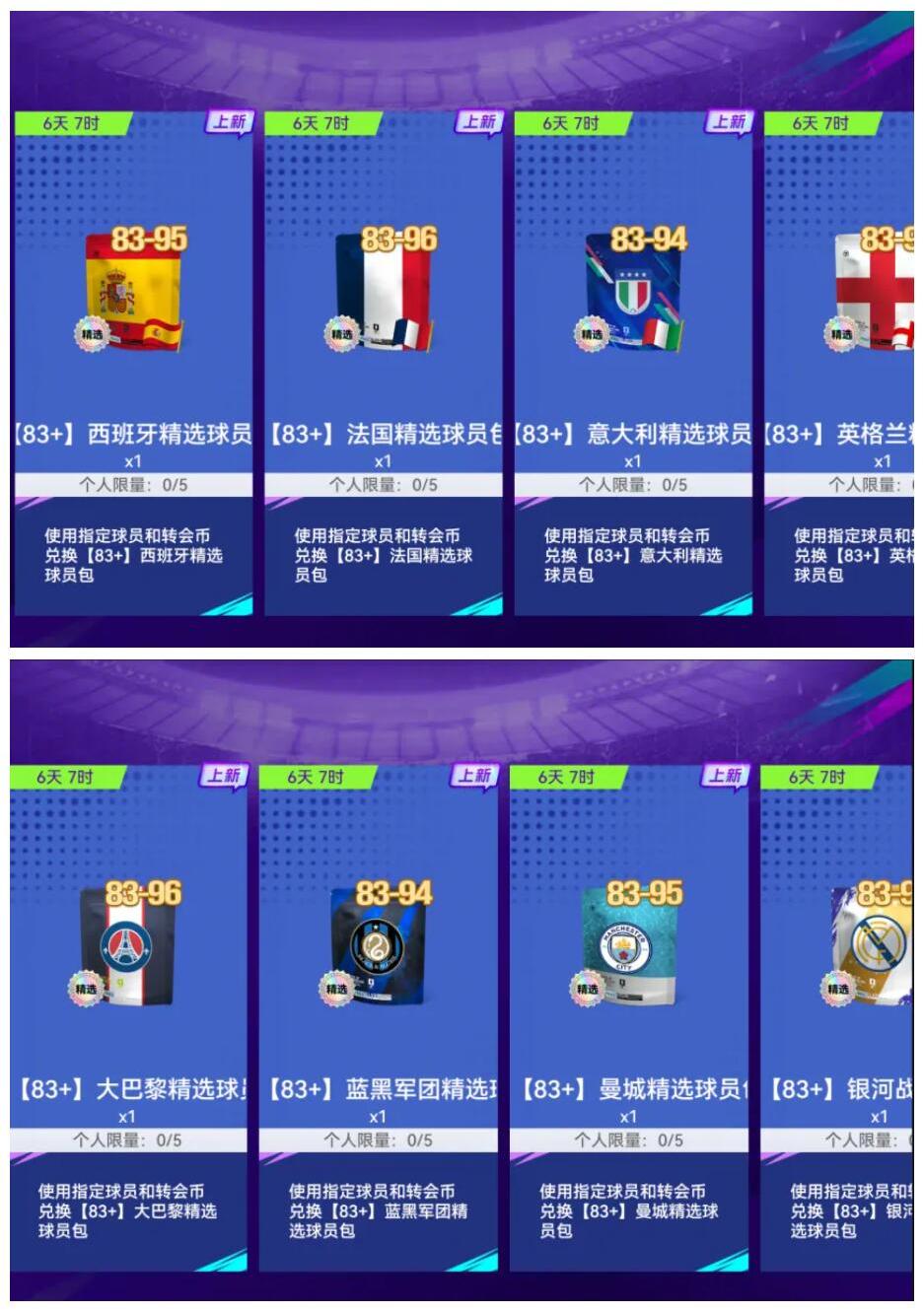 ②全维度队套补给站,国家队史诗阵容、豪门联赛精选、热门赛季球员、限定主题...多元精选卡包限时集结逐步开启,一键搜集心愿阵容!