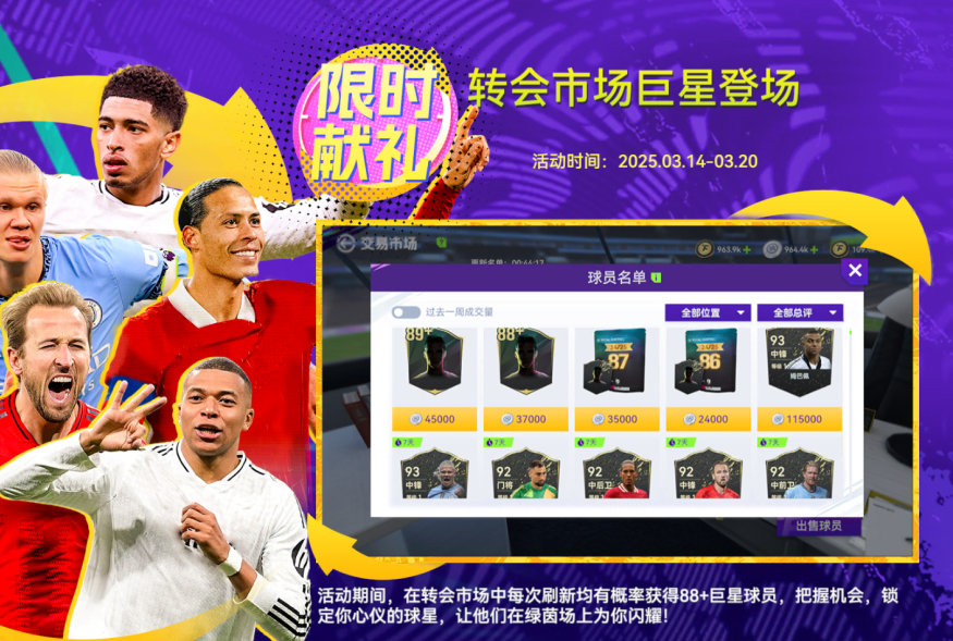 活动期间,在转会市场中每次刷新均有概率获得88+巨星球员,把握机会,锁定你心仪的球星,让他们在绿茵场上为你闪耀!