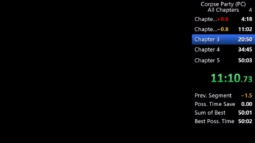 这是PC版《尸体派对》的章节一速通内容,展示了速通过程中的游戏场景,该章节速通用时4分18秒,还显示了游戏其他章节的速通时长,能为想要速通该游戏的玩家提供参考。