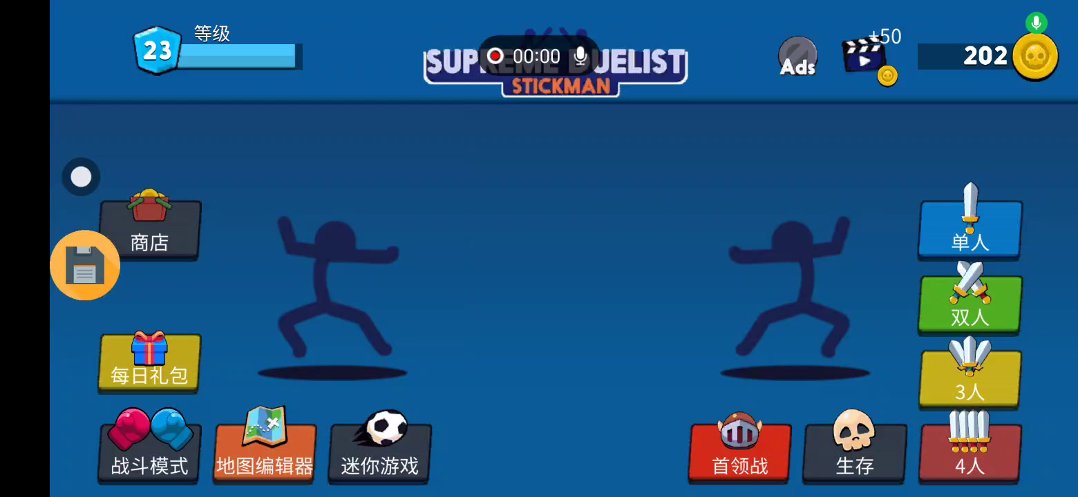 至尊决斗火柴人是一款有趣又疯狂的火柴人手机游戏 新的迷你游戏模式: - 与您的朋友在同一设备或 VS CPU 上玩足球 - 大量地图(新地图编辑器) - 简单控制 - 玩和解锁新皮肤 -1 玩家、2 玩家、3 玩家、4 玩家,具有 CPU 和生存模式 - 逼真的火柴人布娃娃 -2d 物理棒战斗 - 创造你的自己的火柴人战士不同的模式-重力(开/关)-即时 KO(如果禁用,水,熔岩等会在接触时造成伤害)-能量护盾(如果禁用,火柴人可以弯腰) 您可以选择您的角色并在 2 人模式中与朋友一起玩