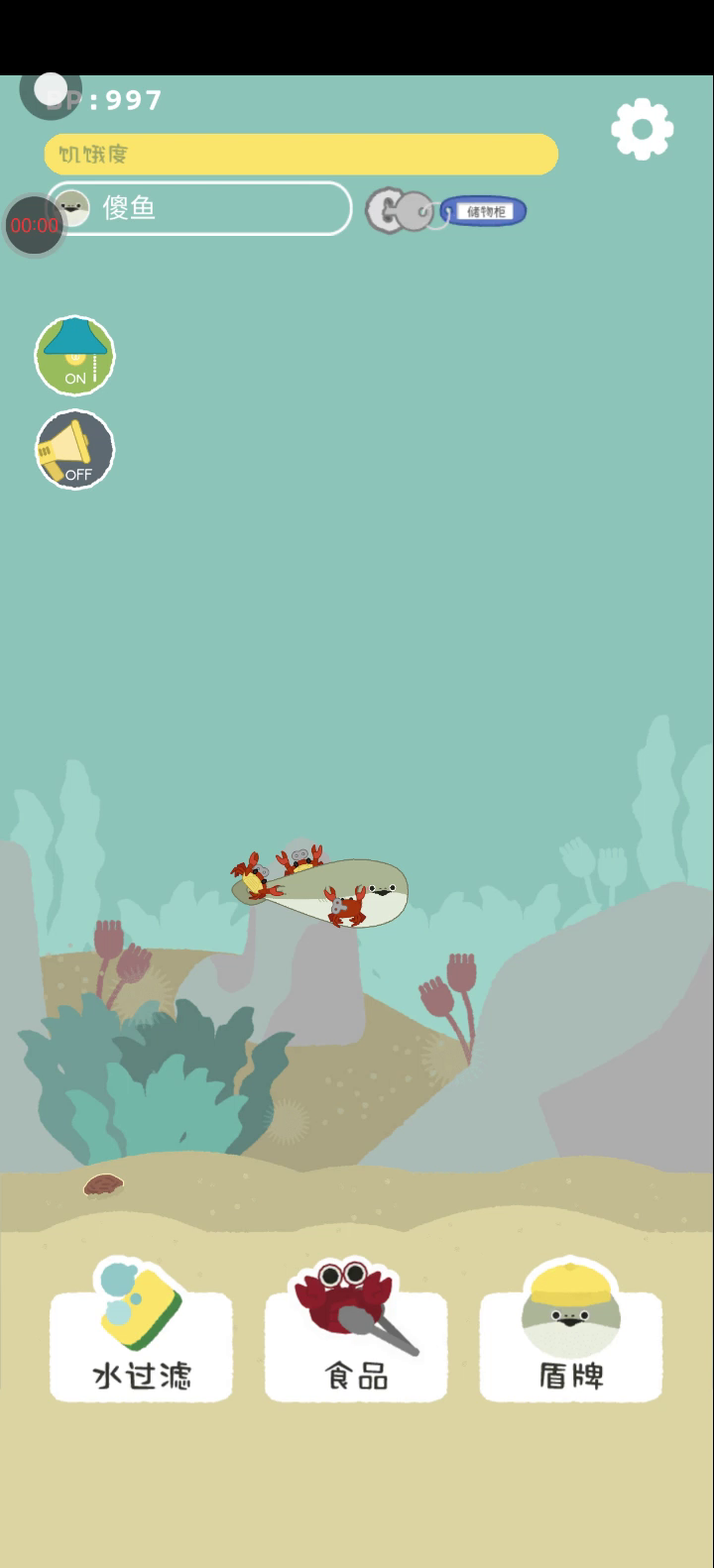 游戏左下角的那个是清洁水的,中间的是喂吃的,右下角的是防护道具,和开关灯,上面的BP就是货币,上面的黄色条就是饥饿值。 游戏进去之后就是一颗鱼卵。孵化后小鱼在不关灯情况下每一个小时就要给它清理鱼缸和喂食,不然会死掉。 长大以后饥饿值会消耗慢一点但是鱼缸依旧要经常清理,不然也会死掉的。 关灯之后小鱼会停止生长也不会消耗饥饿值,但是水还是会脏。 小鱼时不时(经常)会被三叶虫和邓氏鱼劫持,被劫持就一直点那只挟持它的生物就行了。