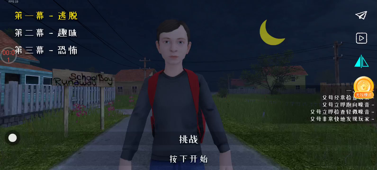 12月30日最新版本0.453已更新~ 【更新内容] 新模式:水平镜像模式。 错误修复。 【如何设置中文】 进入游戏后-点击右上角暂停-点击中间的设置按钮-点击English-选择中文-即可设置中文 游戏目前只解锁第一章~后续章节正在开发中~ “啊,你这个流氓!快点学习!”父母这么说着并把你软禁起来。试着比你的父母更聪明,找到与你的朋友一起出去玩的方法。 沉浸在一个因在学校成绩不好而受到父母惩罚的小学生的角色中,尝试在不被父母发现的情况下逃出家门。 关键机制: - 3D 第一人称游戏。 - 潜行,隐藏,不要被抓住,也不要发出声音! - 拼图,解决谜题,寻找物品来计划你的逃生。 - 小心,父母可能会注意到打开的柜子和门。