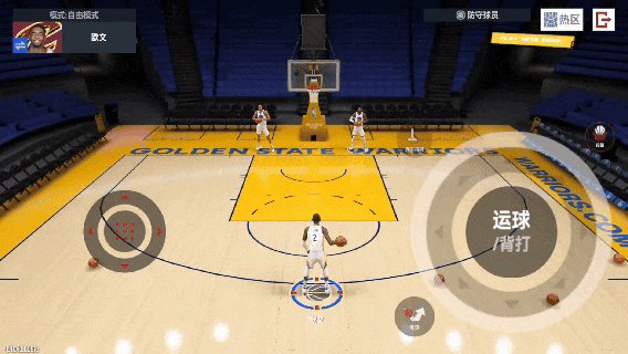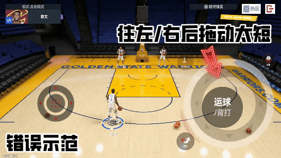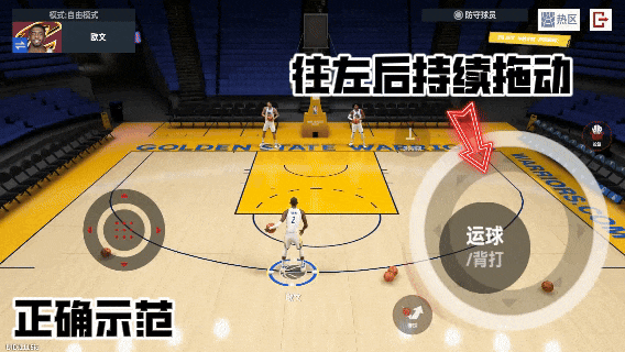 原地运球时,根据持球手的方向不同,选择向右下↘或是左下↙拖动,可以触发专属撤步投篮动作,需要注意的是拖动右侧运球键时,需要持续拖动,如果是单次快速拖动则会变为原地背运。