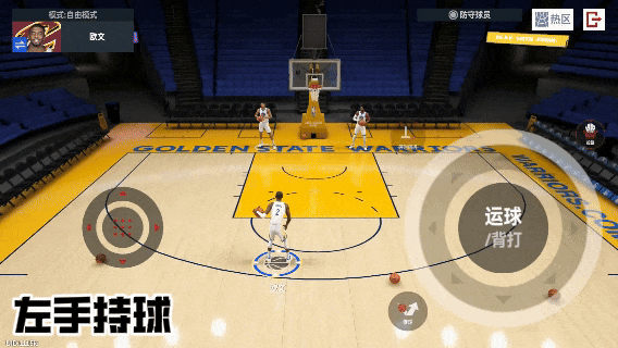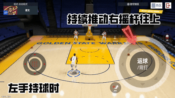 左手带球时,滑动右摇杆向左下↙,即可实现垫步后撤投篮(Tips:左手垫步后撤可以打断投篮动画进行拜佛衔接运球动作)滑动右摇杆右下↘则触发炸球后撤步投篮。