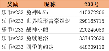 我们将在正确参与活动的玩家中,随机抽取5名,送出【乐币*233】;