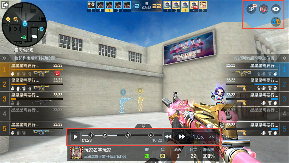 Replay回放系统在观战视角的基础上,增加了播放功能区和特殊功能区,分别位于屏幕下方和右上方。