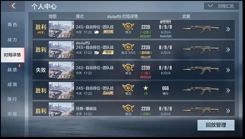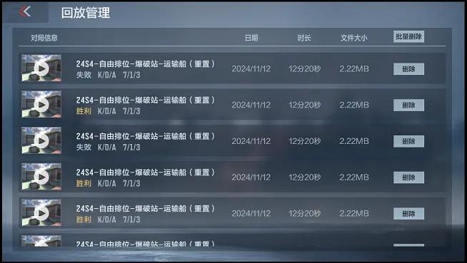 回放管理界面提供了已下载对局回放的地图、模式、KD、时间等信息,方便CFer们快速辨别想要回看的对局,同时也提供了删除/批量删除的功能,防止回放占用过多存储空间。