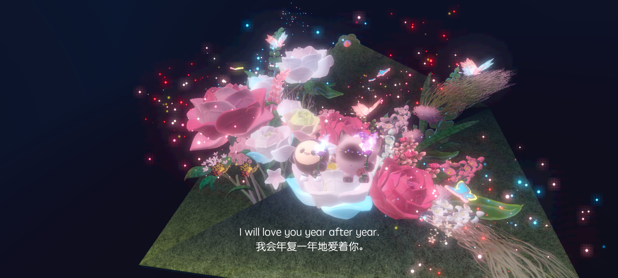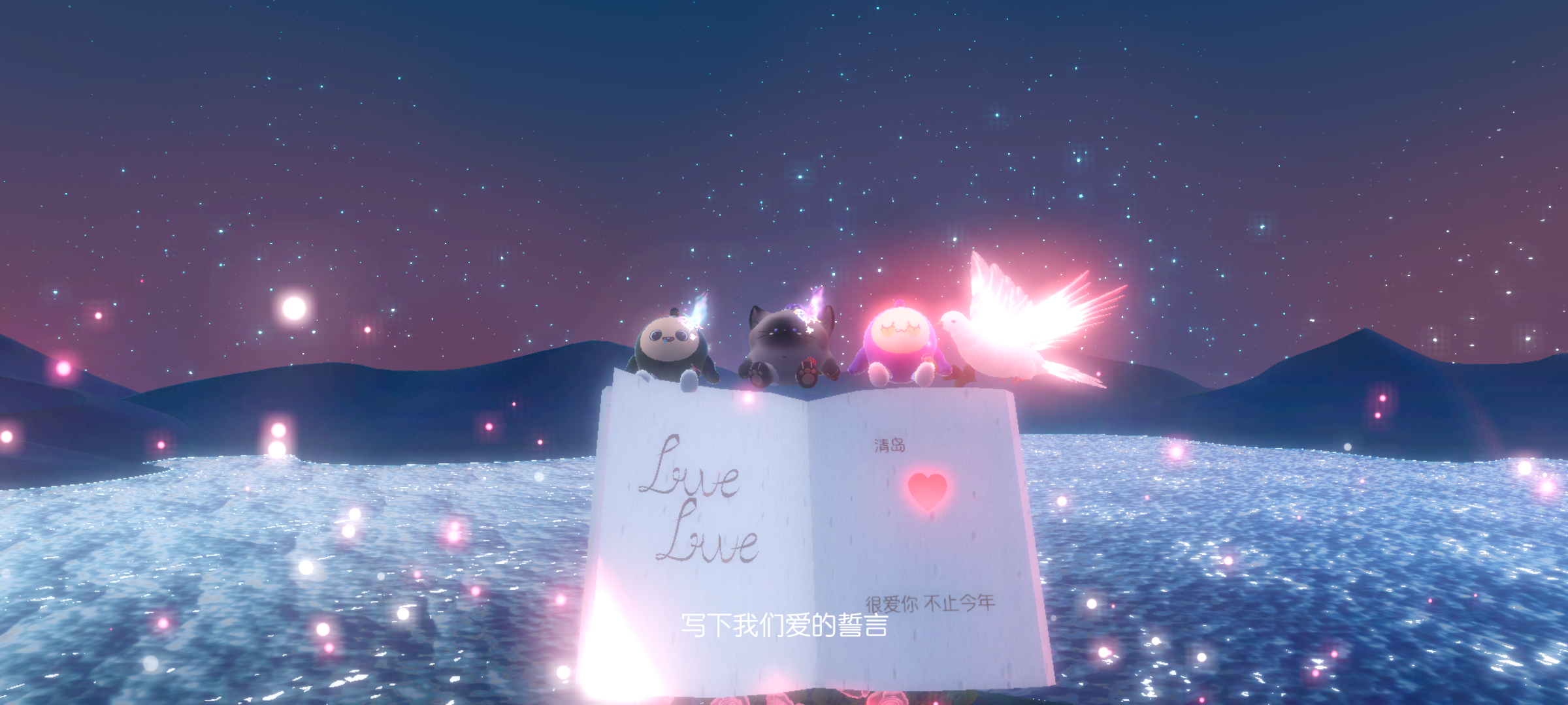 书的左右两边都有字,左边是love,右边可以写上你们的名字还有誓言,下边还有超浪漫的玫瑰花海呢~誓言靠近书就可以写啦,点击右边的黑框哦~💭