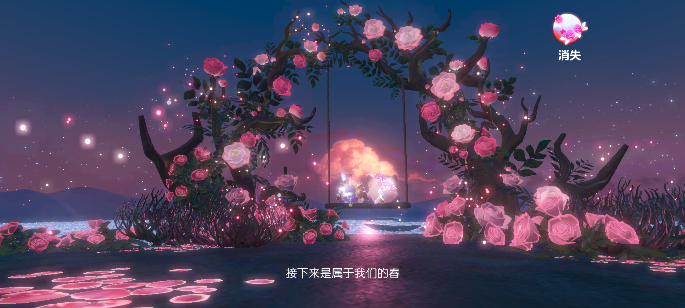 这里是正前方的一个打卡点,是用树枝和玫瑰花制作而成的,中间的秋千可以隐藏,点右上角的消失就可以啦~消失之后还可以看到天空,是超美的晚霞呢~超级浪漫奥💫
