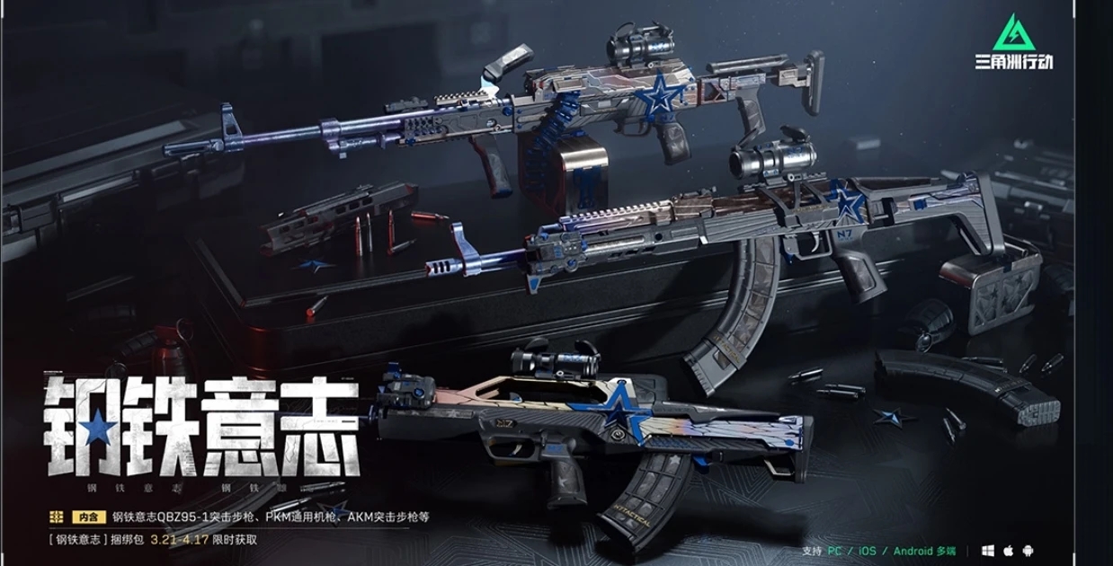 钢铁意志系列,包含:QBZ95-1突击步枪、AKM突击步枪和PKM通用机枪,传说品质,2400三角券。枪械整体风格主打的一个黑铁纪念版。反光漆面贯穿全身体,蓝色五角星放置在扳机上方,安全感满满!捆绑包整体质量不好评价!喜欢的AKM但是没有合适皮肤的可以入手,也可以等一手猎宝团皮肤,不仅便宜还质量高~