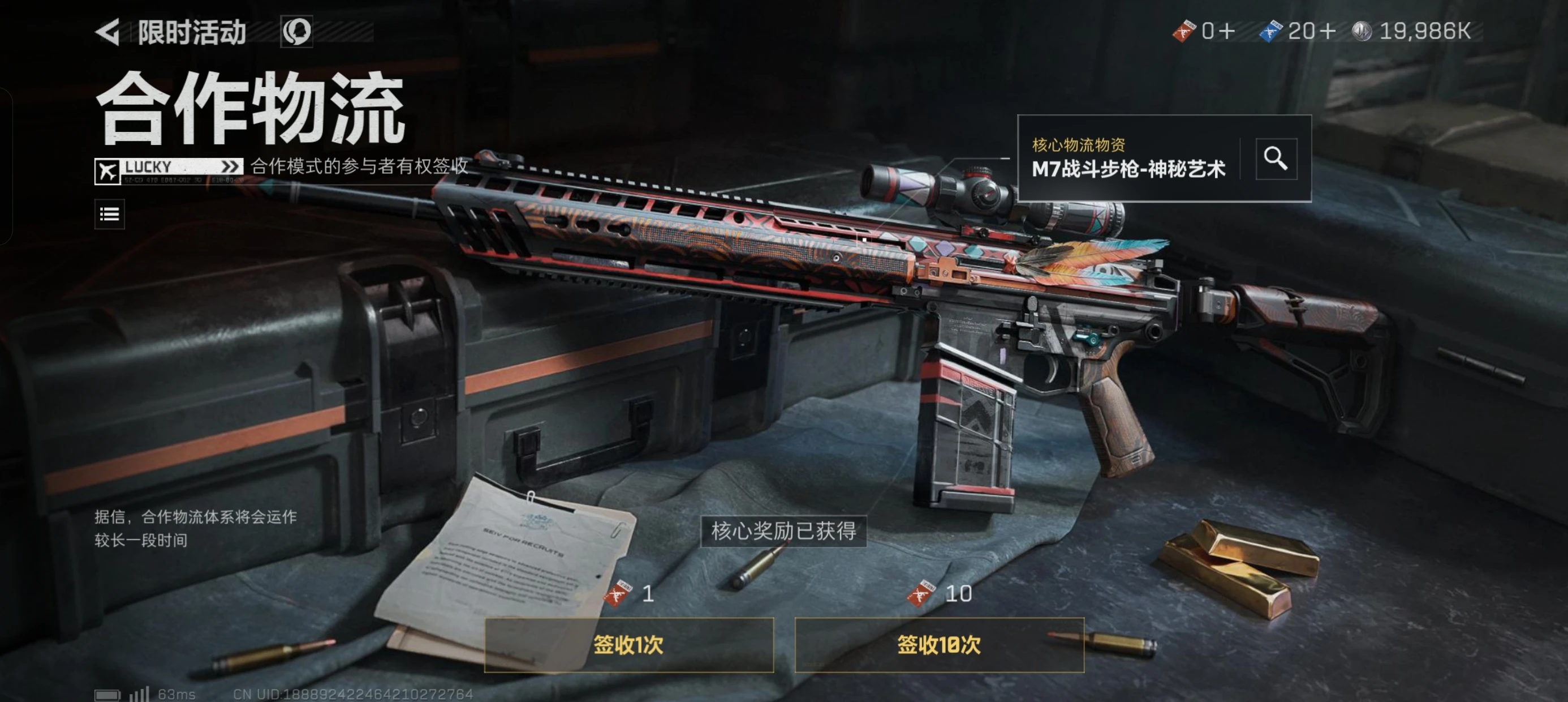 而对玩家最大的影响就是M7传说皮肤-神秘艺术以及衔尾蛇隐藏成就也都将成为绝版!所以没获取的抓紧时间,机不可失,失不再来!合作物流抽奖不仅可以获得皮肤,还可以获得即将增强的MP7特种全装包,打一局运气好点相当于500万撤离~