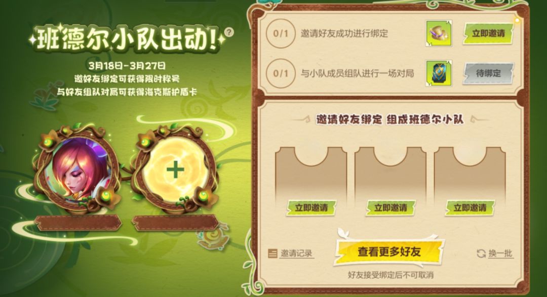 截止至3月27日,召唤师邀请好友绑定组成班德尔小队,即可获得限时称号-社交之星(7天)。同时,与好友组队对局还可获得海克斯护盾卡~