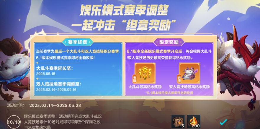 娱乐模式赛季调整,一起冲击“终章奖励”!截止至3月28日,召唤师完成大乱斗或双人竞技场累计10场对局,即可领取深渊之骰*5与龙魂水晶*200奖励~