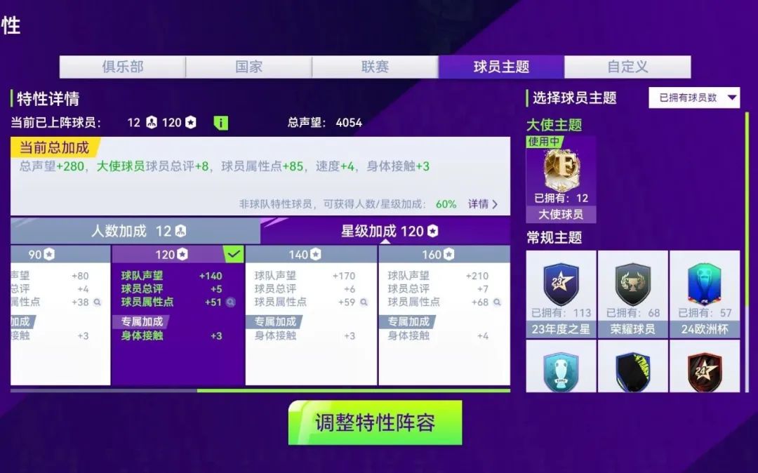 当前档位的大使球队特性加成为:全属性+5,速度+4,身体接触+3,全属性+5。已经和其他俱乐部、国家队满人满星的加成相持平。