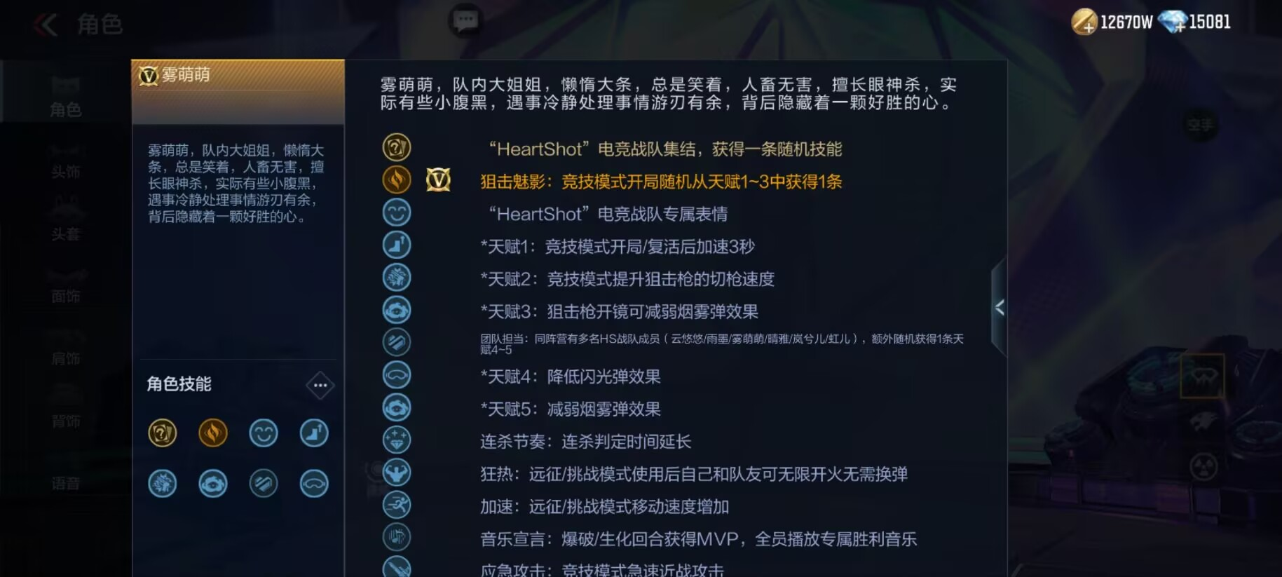 在技能上,雾萌萌拥有专属技能“狙击魅影”,在该技能的加成下,雾萌萌在竞技模式中开局则会从“竞技模式开局/复活后加速3秒”,“竞技模式提升狙击枪的切枪速度”,“狙击枪开镜可减弱烟雾弹效果”3条天赋中随机获得一条,加成效果都十分实用!