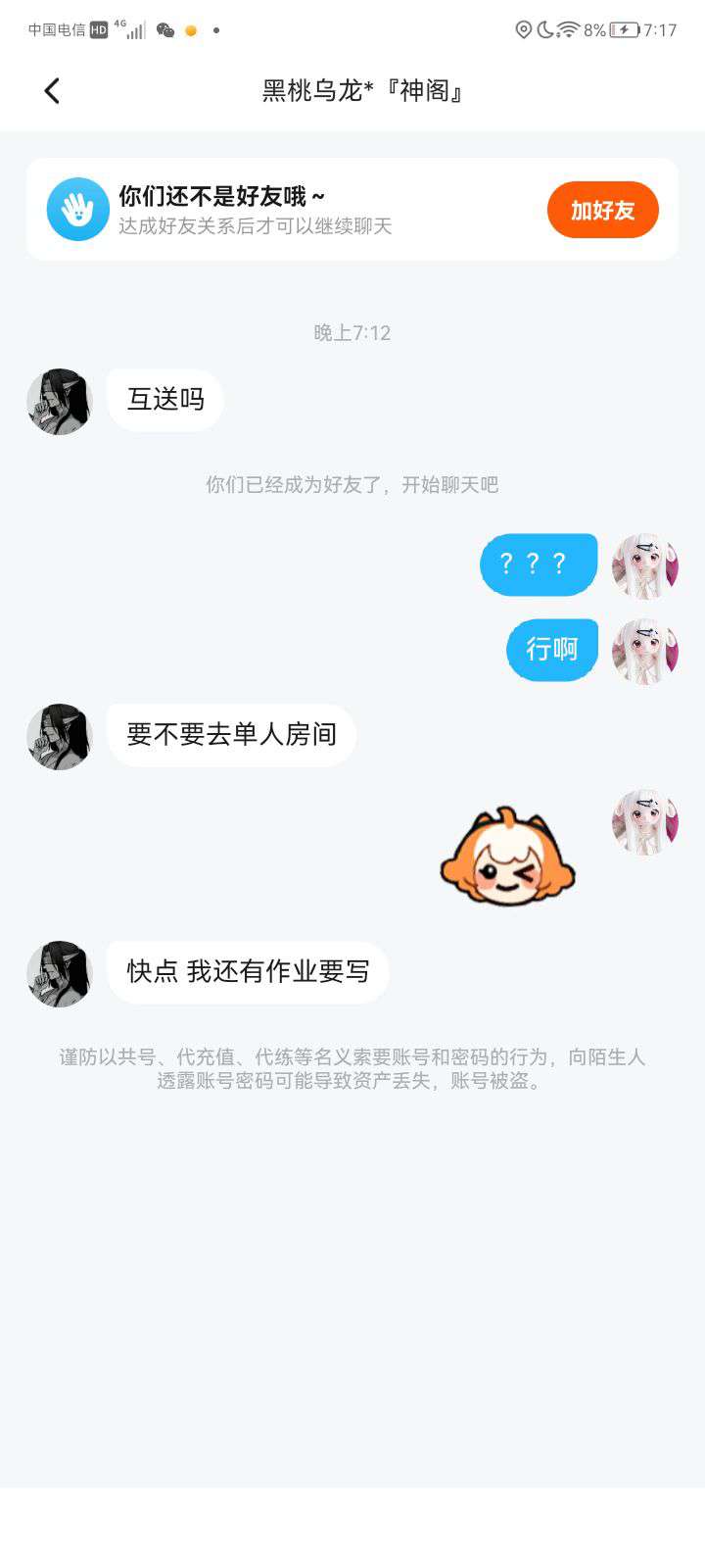 曝光 这个人,他加我说互送 我们俩去单人房间,我先送他620的,然后他让我挑贵一点的,问他还有多少币
