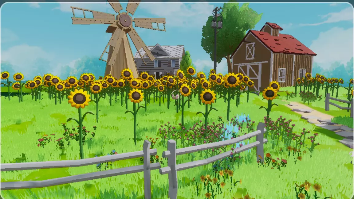 地图不进只有向日葵🌻花海,还有很多的打卡地点。下面是绿油油的草地,上面是数不尽的向日葵🌻,在向日葵的旁边还有几间小房子,还有一个大风车,房子的角落还有一些动物(牛🐮)作为陪衬,显得房子不在单调。在向日葵花海中,还有一个秋千让玩家打卡。在向日葵旁边有一个帐篷,帐篷下面有一些桌子和椅子,可以让玩家野炊,野营。在整个陆地的旁边有一片海洋,在陆地与海洋的交界处有一搜小木船,也可以打卡。