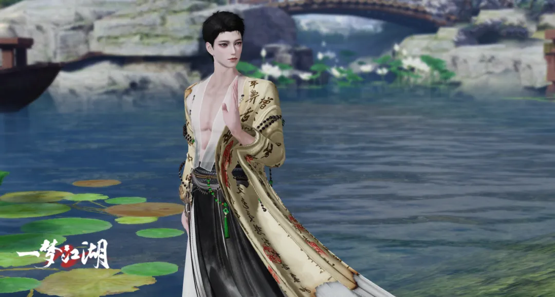 男款发佛在身,两袖印经,犹如焚过书页;佛珠圈圈缠绕臂膀,胸前墨纹又似水漫金山。华裳轻袭,衣袂随风,却道心无情,困于红尘千般纠缠。