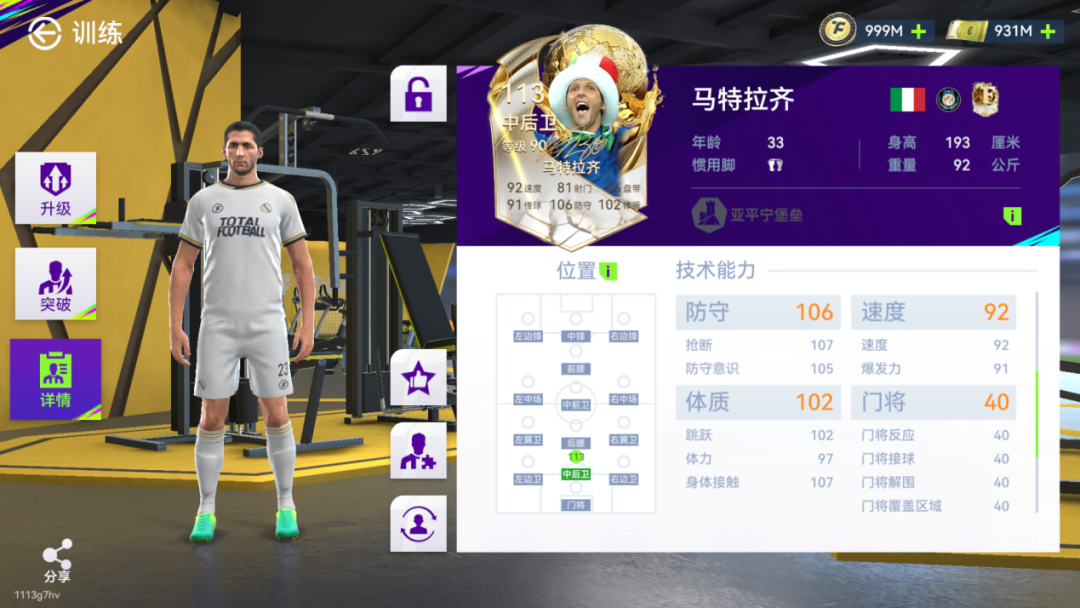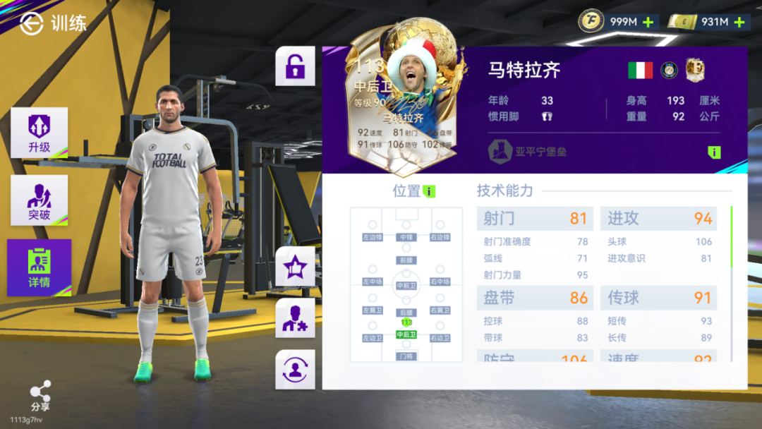 双速90+,防守意识105,抢断107,马特拉齐的地面防守能力也同样出色。传球91、控球88,这让马特拉齐在后场也有一定的传球、组织能力。