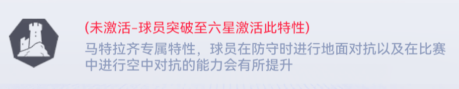 马特拉齐专属特性,球员在防守时进行地面对抗以及在比赛中进行空中对抗的能力会有所提升。