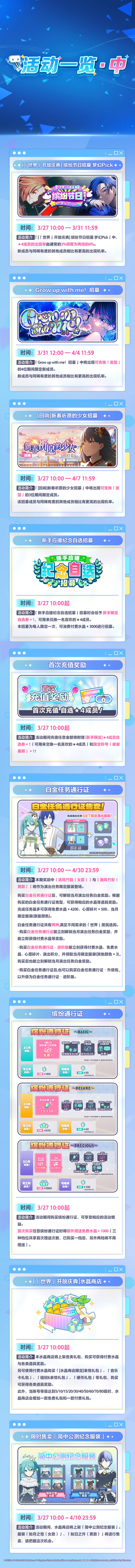 欢迎居民入住!通过「世界」入住任务立即获得:★4[向大家呈献首演] 初音未来,完成任务可得★4成员自选券、服装「世界风」(女款&男款、全颜色)及大量水晶奖励哦!