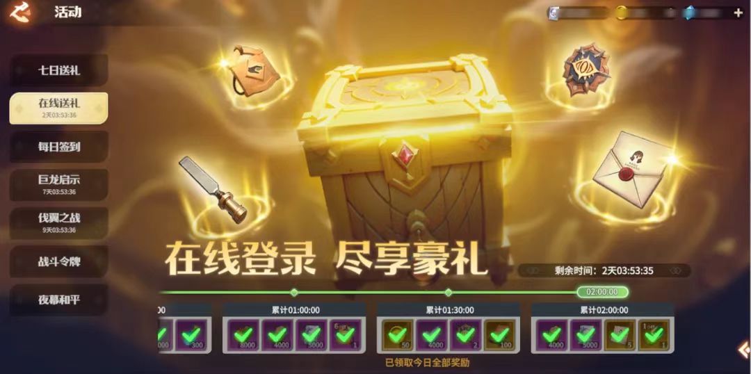 创建账号后前三天开放活动,活动期间,每日在线时长达到要求即可获得丰厚奖励!