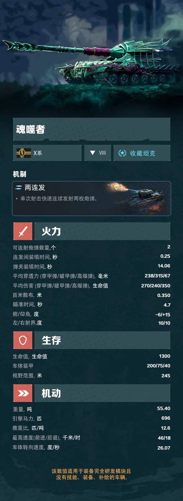 1300点的生命值与较大的车身,且转向速度较慢,在战斗中需避免硬刚缠斗;但魂噬者拥有优秀的直线极速,独特的两连爆发,以及中远距离不俗的命中率,二线支援或许才是它的最佳打开方式,做到战场支援,极速必达!